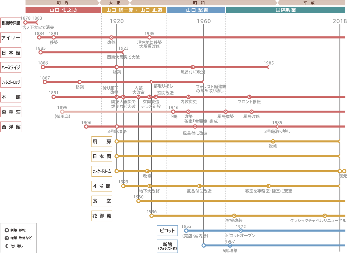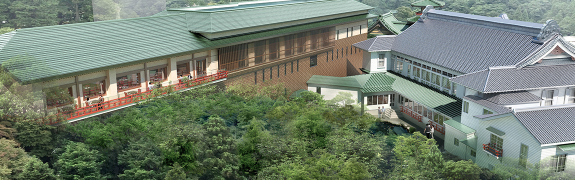 In 1887, middle of Meiji period, a Japanese-style building was erected next to the Haya River on the other side of National Route 1. Emperor Hirohito even stayed there in his childhood during the summer months. The building was relocated to its current location at the end of the Meiji period and came to be known as FOREST LODGE. Its number of rooms was increased to accommodate more guests but then downsized in 1937 due to the construction of FLOWER PALACE. The dismantled materials were taken to Sengoku Golf Course and converted into other structures. FOREST LODGE was re-constructed at 1960, "FOREST", the name long loved by hotel guests, pass to the new annex as "FOREST WING" reborn at 2020.