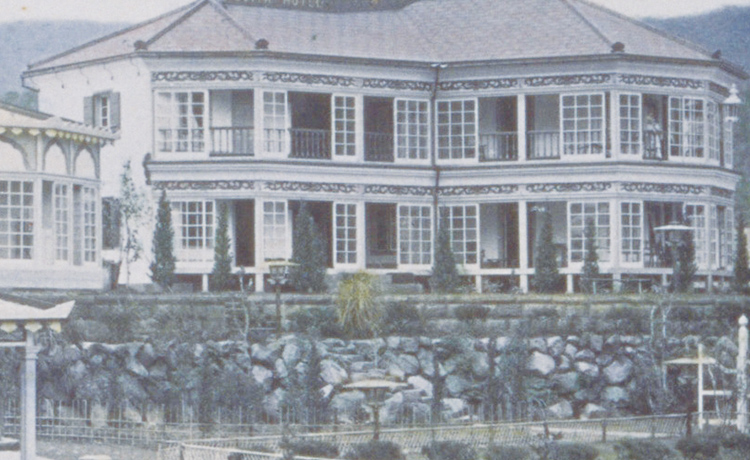 Sennosuke Yamaguchi was determined to open a hotel catering specifically to foreign clientele. He picked out Miyanoshita for its picturesque scenery of Hakone and Mt. Fuji, its short distance from Tokyo and Yokohama, and a hot spring. It was to be the location of Japan's first real Western-style hotel in 1878. Craftsmen that had been involved in the construction of Western-style buildings in Yokohama were reportedly brought to Miyanoshita to build this foreign-style building with an L-shaped facade. The Western-style balconies and glass doors gave the building a very distinctive look, but it also incorporated an element of Japanese-style architecture with a half-hipped roof. The other The Fujiya Hotel buildings constructed later on would incorporate large gabled entrances in this same style. Unfortunately, this first building was razed to the ground only five years after its completion in the Great Miyanoshita Fire.