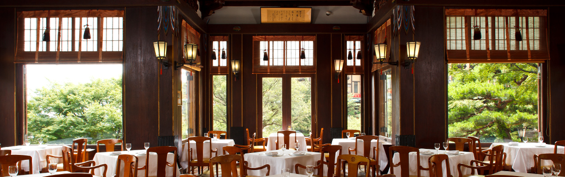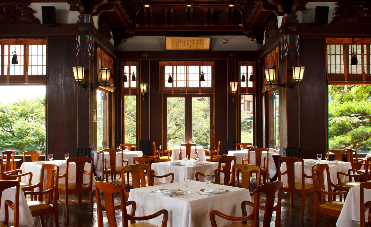 The first major building constructed in the aftermath of the Great Kanto Earthquake—seven years after, to be precise—was DINING ROOM. Reinforced concrete on the first floor supports the timber second floor, and the tower called the Shotenkaku. The high-quality materials and detailed décor create a strong sense of impeccability. The copper-clad gable roof and five-storied pagoda-like tower are designed in the style of temples and shrines and the use of color on the balustrades and walls is also quite unique. This architectural style marks a radical departure from the other noble, Western-style The Fujiya Hotel buildings and thus captures fresh dynamism. Shozo Yamaguchi named the main dining room on the second floor "THE FUJIYA" because he strongly felt that it truly embodies what The Fujiya Hotel is all about.